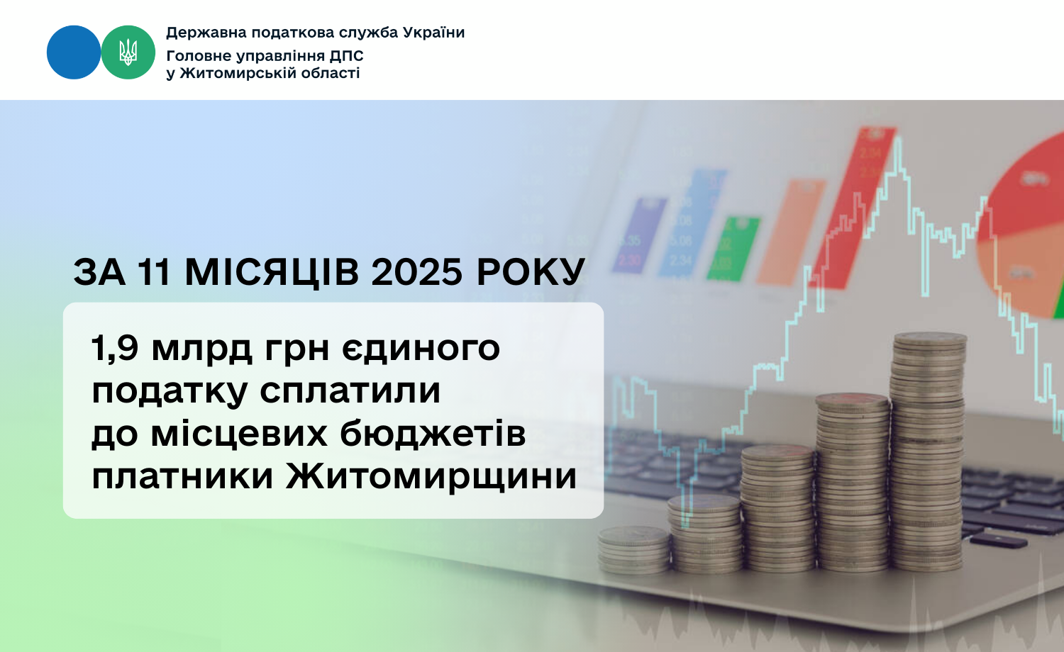 «За 11 місяців 2025 року суб’єкти господарювання Житомирщини, які перебувають на спрощеній системі оподаткування, сплатили до місцевих бюджетів 1,9 млрд грн єдиного податку. Це на 20 відсотків, або на 326,6 млн грн більше порівняно з січнем – листопадом минулого року», – повідомив начальник Головного управління ДПС у Житомирській області Олександр М`ясковський.