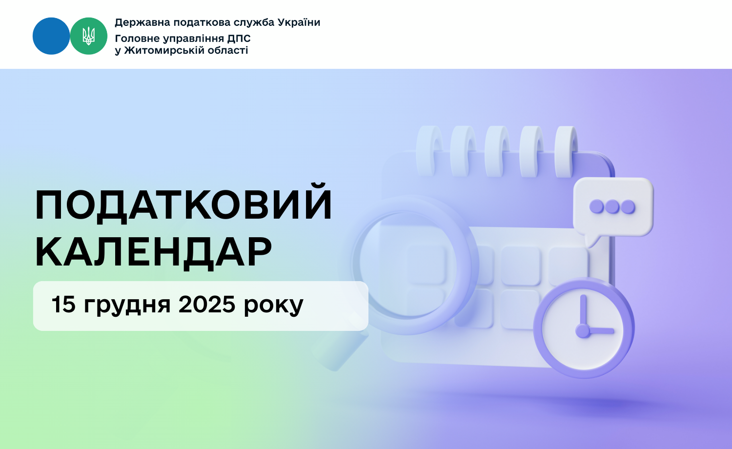 Головне управління ДПС у Житомирській області звертає увагу, що 15 грудня 2025 року, понеділок, останній день подання за листопад п. р.: