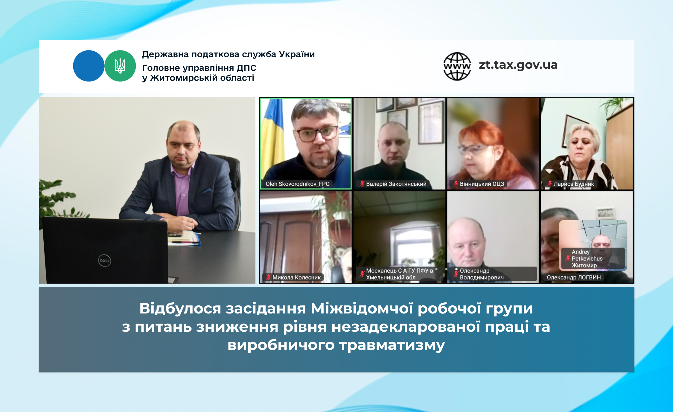 Засідання робочої групи відбулося у форматі онлайн за участі представників Центрально-Західного міжрегіонального управління Державної служби з питань праці, а також представників Головного управління ДПС у Житомирській області.