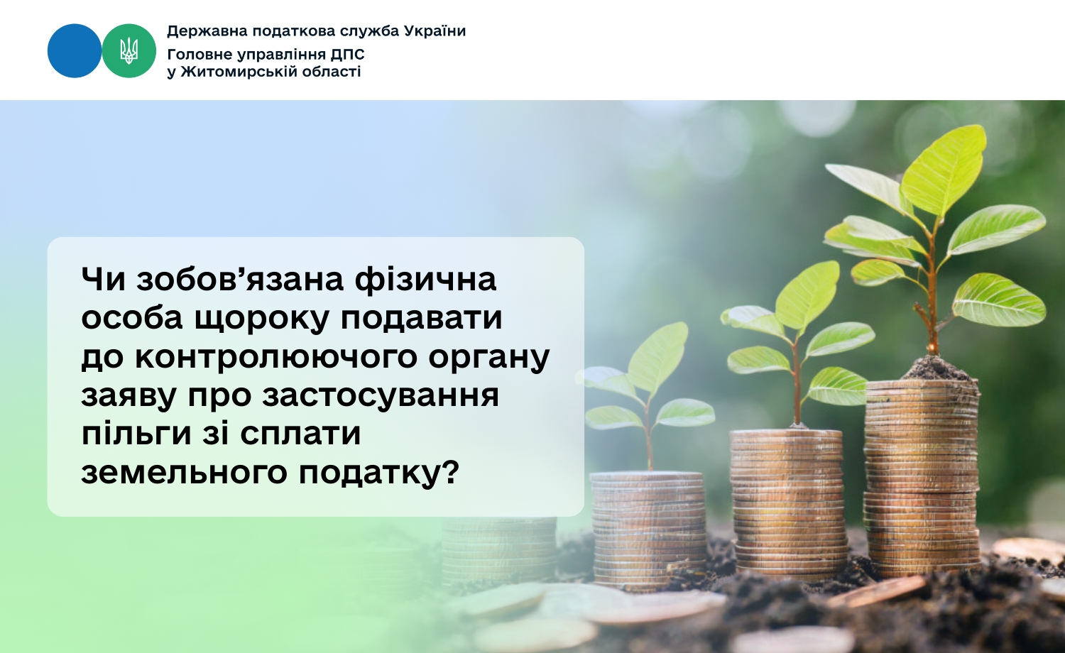 Головне управління ДПС у Житомирській області повідомляє, що відповідно до п. 287.2 ст. 287 Податкового кодексу України від 02 грудня 2010 року № 2755-VI (далі – ПКУ) облік фізичних осіб – платників податку і нарахування відповідних сум проводяться контролюючими органами за місцем знаходження земельної ділянки, у тому числі право на яку фізична особа має як власник земельної частки (паю), щороку до 01 травня.