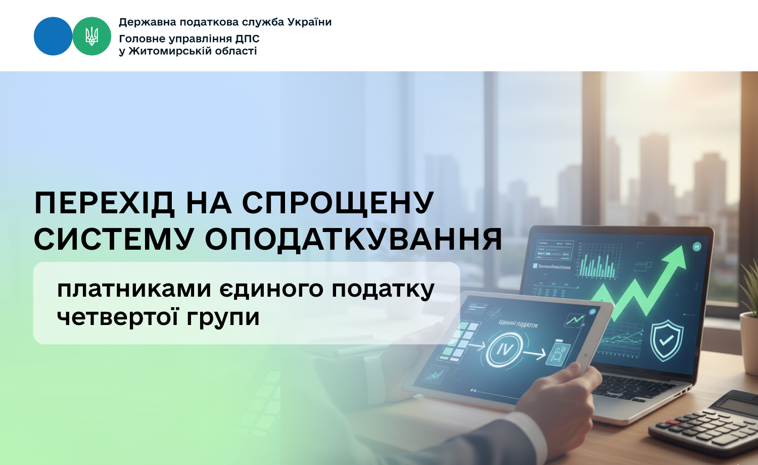 Головне управління ДПС у Житомирській області інформує, що порядок обрання або переходу на спрощену систему оподаткування платниками єдиного податку четвертої групи здійснюється відповідно до ст. 298 Податкового кодексу України (далі - Кодекс). Згідно з нормою п.п. 298.8.1 п. 298.8 ст. 298 Кодексу визначається, що сільськогосподарські товаровиробники для переходу на спрощену систему оподаткування або щорічного підтвердження статусу платника єдиного податку подають не пізніше 20 лютого поточного року: