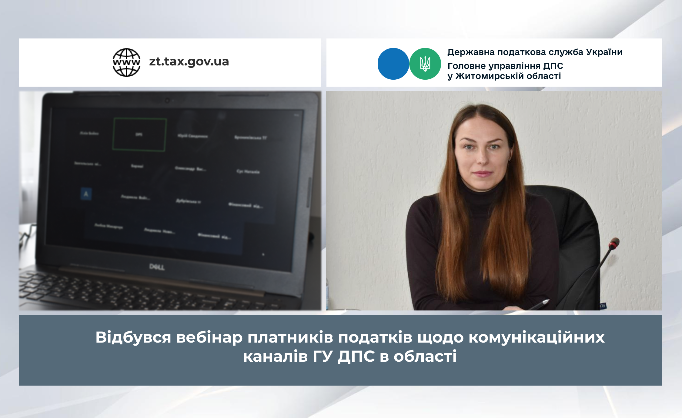 Головним управлінням ДПС у Житомирській області (ГУ ДПС) проведено онлайн-вебінар для платників податків, який відбувся у форматі відеоконференції на платформі Zoom. Захід був спрямований на інформування суб’єктів господарювання та громадян про дієві комунікаційні канали взаємодії з податковою службою та можливості отримання податкової інформації й консультацій у зручному форматі. Важливо, що розвиток таких каналів комунікації є складовою політики безбар’єрності, адже вони забезпечують рівний доступ до послуг для всіх категорій платників податків незалежно від місця перебування чи фізичних можливостей.