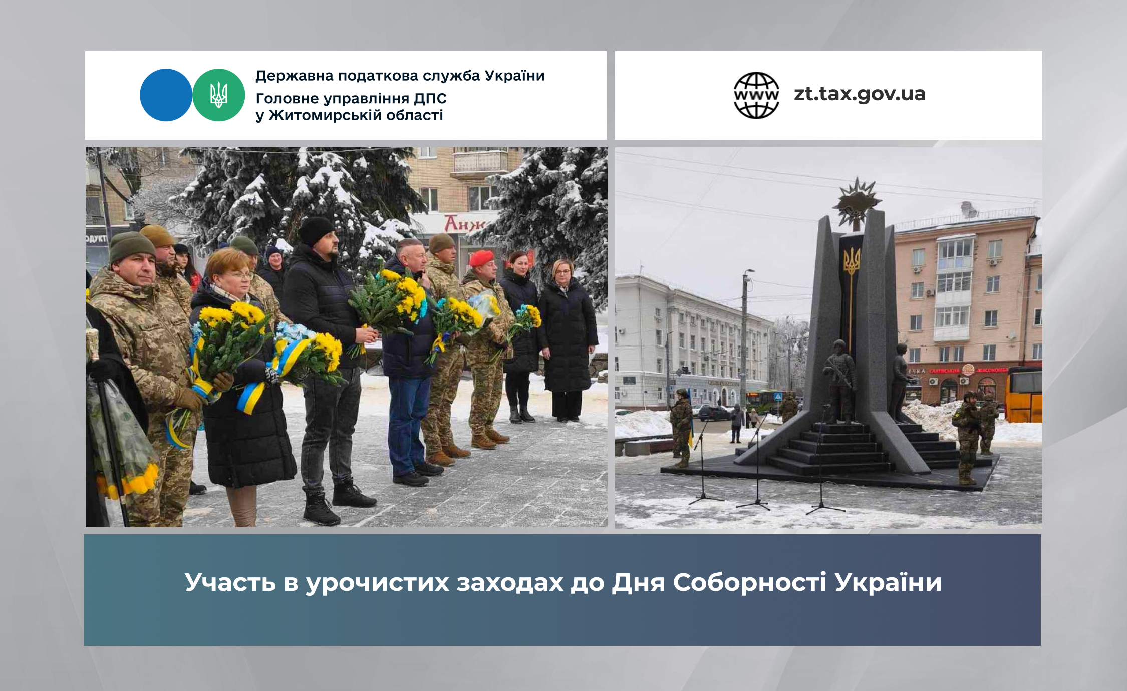 З нагоди Дня Соборності України працівники Головного управління ДПС у Житомирській області долучились до урочистих заходів, присвячених одній із найвизначніших дат в історії нашої держави — дню, що уособлює віковічне прагнення українського народу до єдності, свободи та незалежності.