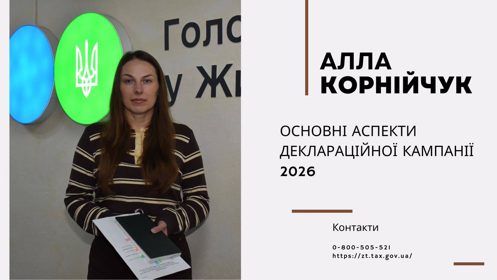 Начальник відділу інформаційної взаємодії Головного управління ДПС у Житомирській області Алла Корнійчук в інтерв’ю ведучому радіостанції «Українське радіо Житомир» Ігорю Епельбойму розповіла про основні аспекти деклараційної кампанії 2026.
