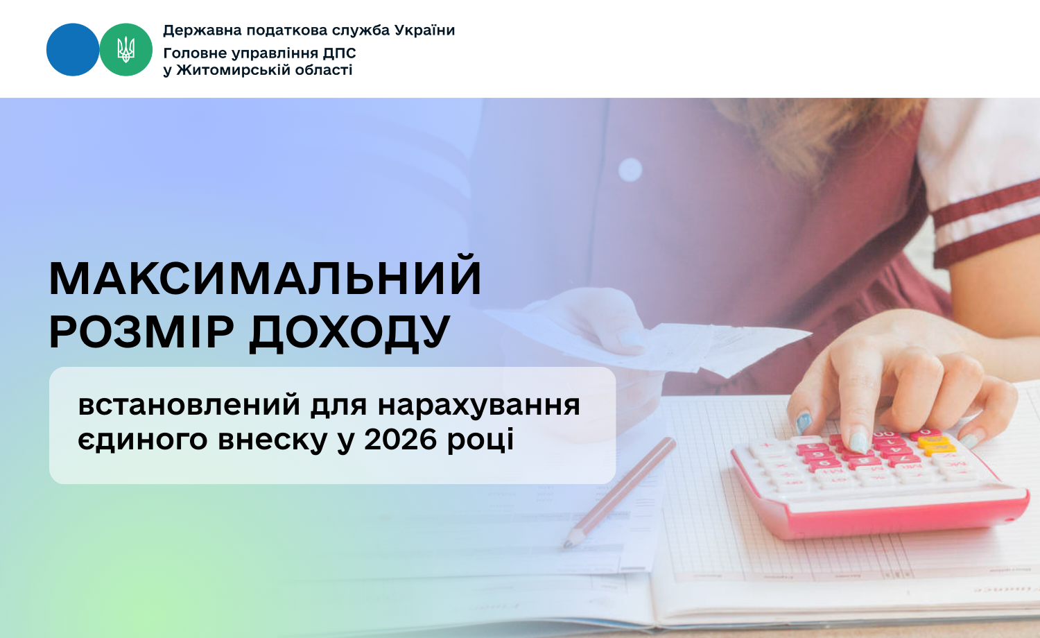 Головне управління ДПС у Житомирській області повідомляє, що Статтею 32 Закону України від 03 грудня 2025 року № 4695-IX «Про Державний бюджет України на 2026 рік» установлено, що у 2026 році розмір максимальної величини бази нарахування єдиного внесок на загальнообов’язкове державне соціальне страхування (далі – єдиний внесок) – максимальної суми доходу застрахованої особи на місяць, на яку нараховується єдиний внесок, визначеної Законом України від 08 липня 2010 року № 2464-VI «Про збір та облік єдиного внеску на загальнообов’язкове державне соціальне страхування», дорівнює: