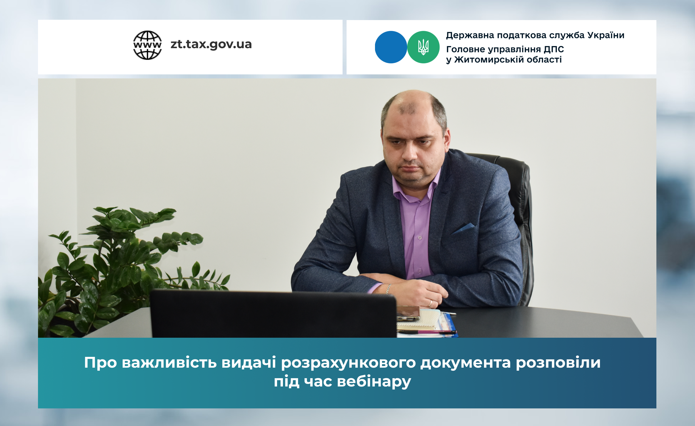 В Головному управлінні ДПС у Житомирській області відбувся вебінар для платників податків області щодо важливості видачі розрахункового документа, його обов’язкових реквізитів та відповідальності за порушення правил оформлення та видачу фіскальних чеків. Захід відбувся в онлайн форматі, що зручно та безпечно в реаліях сучасного часу.
