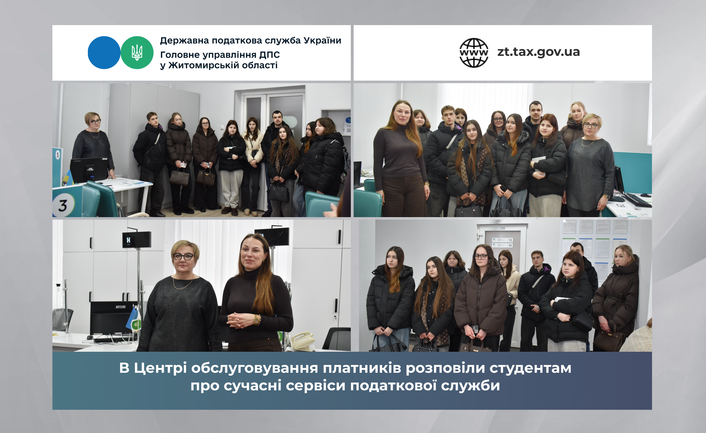 З ознайомчим візитом до Центру обслуговування платників Житомирської ДПІ (ЦОП) Головного управління ДПС у Житомирській області завітали студенти другого курсу спеціальності «Фінанси, банківська справа, страхування та фондовий ринок» ВСП Житомирського технологічного фахового коледжу КНУБА.