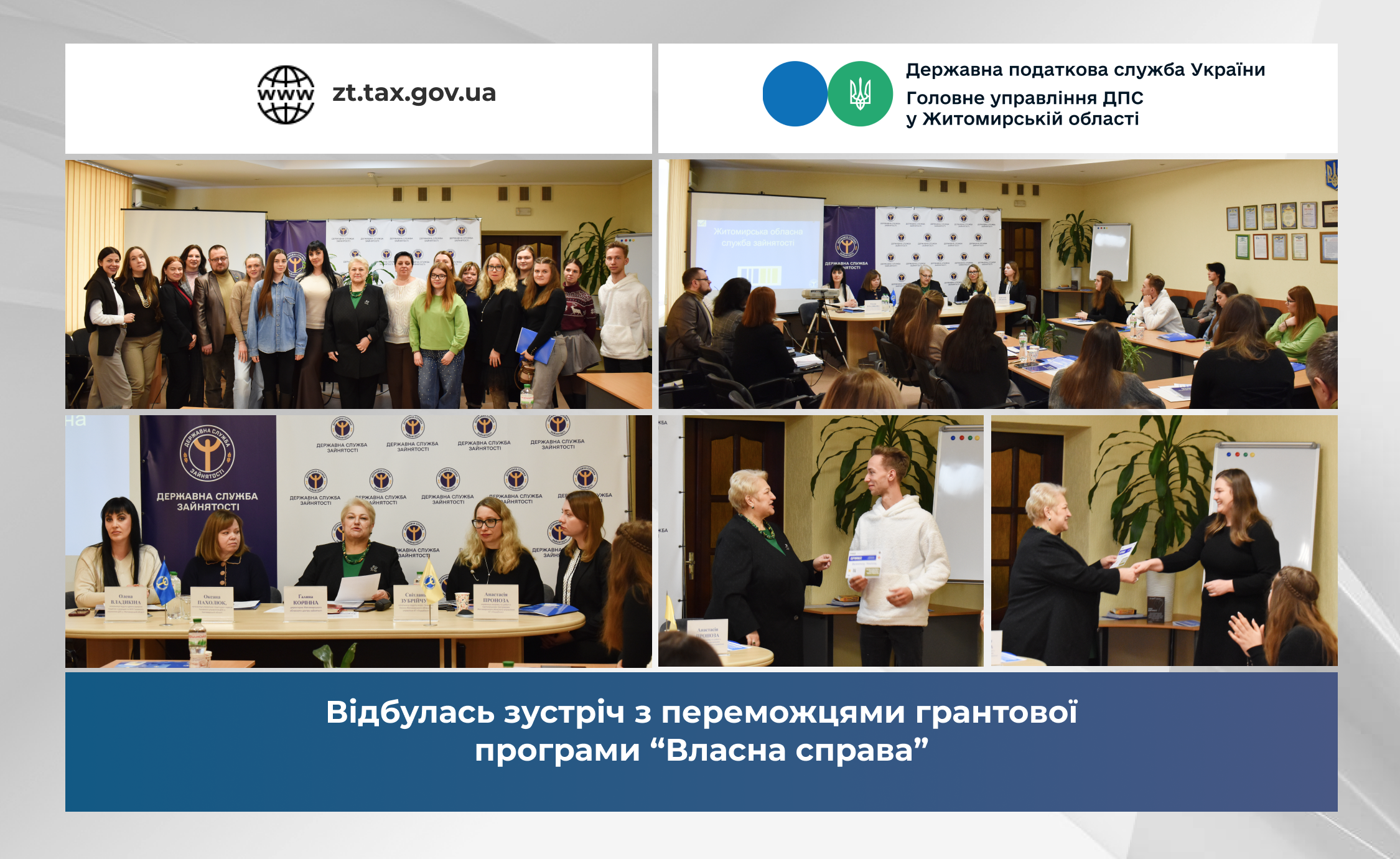 Сьогодні представники Головного управління ДПС у Житомирській області взяли участь у зустрічі з переможцями грантової програми «Власна справа», які отримали позитивні рішення щодо надання мікрогранту для створення власного бізнесу.