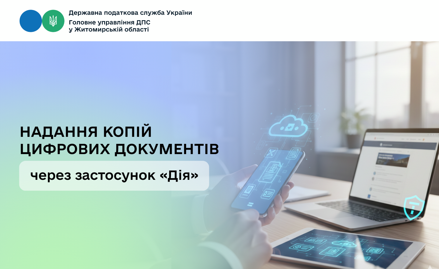 Головне управління ДПС у Житомирській області повідомляє, що Державною податковою службою України забезпечено підключення  інформаційно – комунікаційних систем ДПС до порталу Дія та розроблено програмне забезпечення, за допомогою якого посадовими особами ДПС під час надання адміністративних послуг (зокрема, під час проведення процедур реєстрації, внесення змін до Державного реєстру фізичних осіб – платників податків, а також під час видачі документа, що засвідчує реєстрацію у Державному реєстрі, та відомостей з Державного реєстру) у Центрах обслуговування платників здійснюється отримання (шеринг) електронних копій цифрових документів.