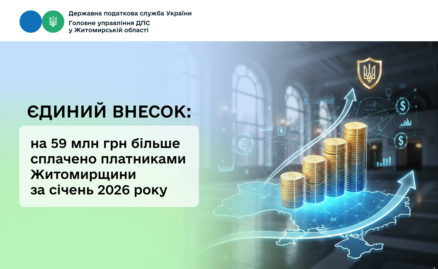 Єдиний внесок: на 59 млн грн більше сплачено платниками Житомирщини за січень 2026 року