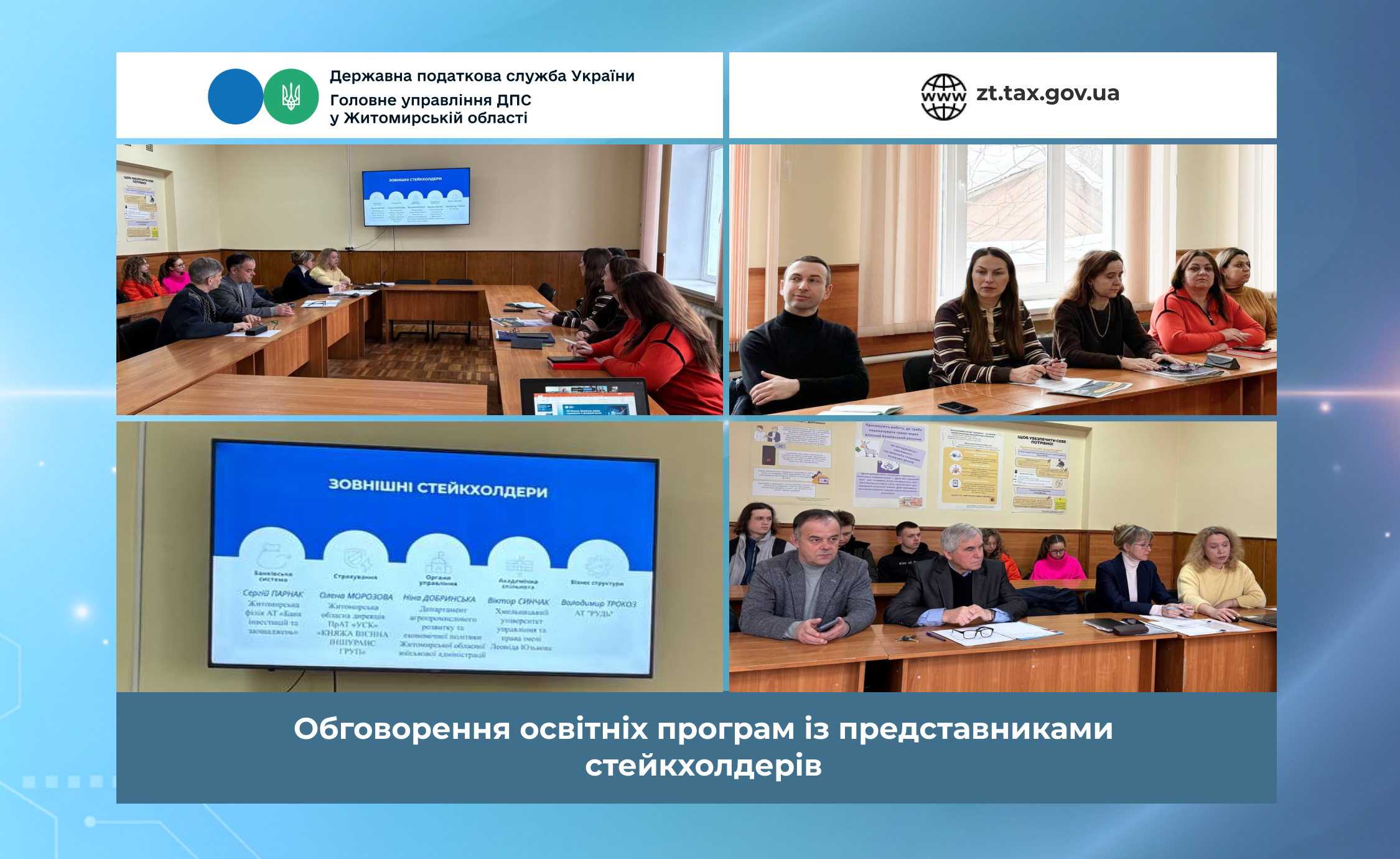 Сьогодні начальниця відділу інформаційної взаємодії Головного управління ДПС у Житомирській області Алла Корнійчук прийняла участь у зустрічі зі стейкхолдерами,  під час якої обговорили зміст і перспективи розвитку двох освітньо-професійних програм – «Фінанси, банківська справа, страхування та фондовий ринок» та «Фінанси, банківська справа, страхування».