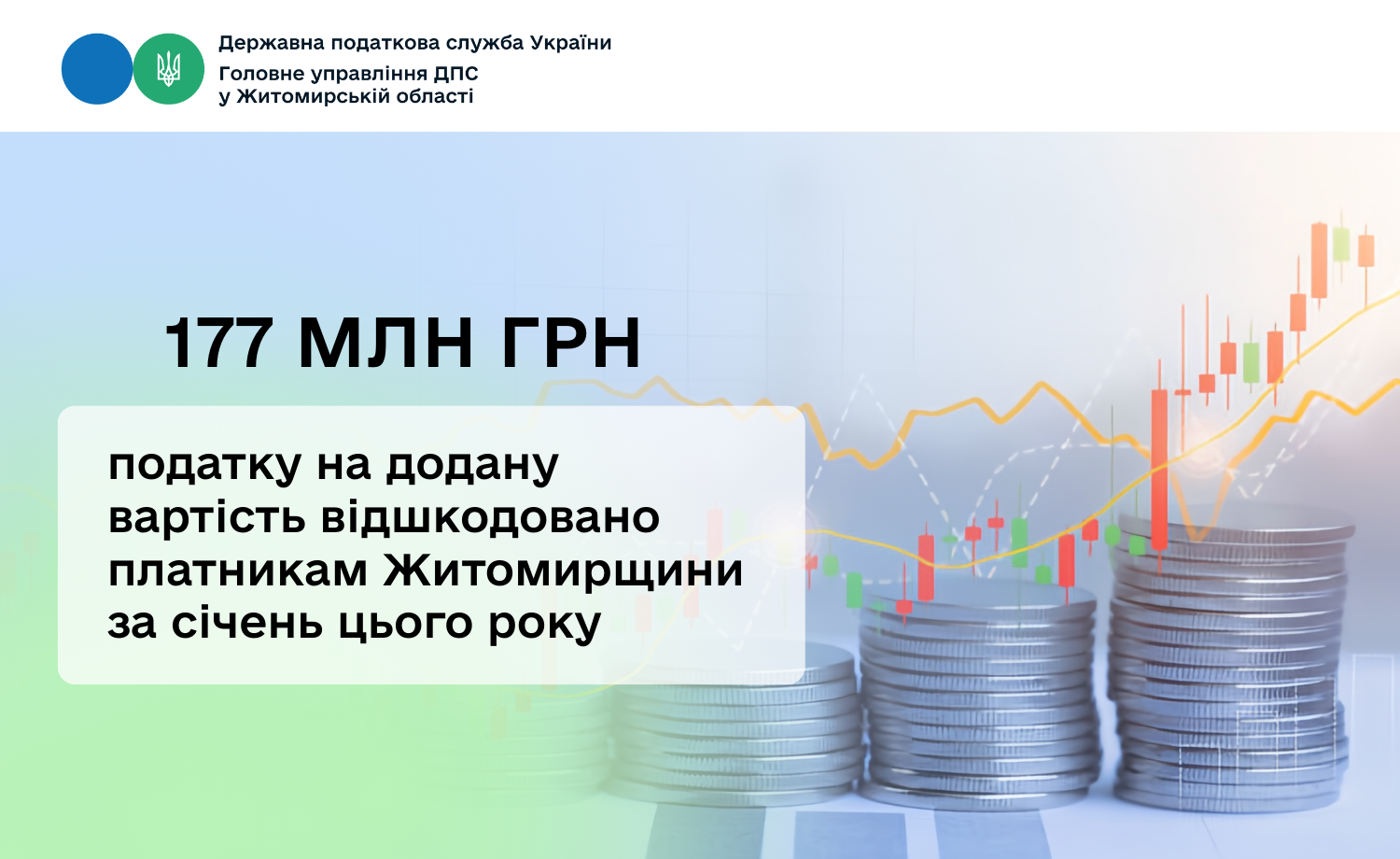 У січні цього року платникам Житомирщини відшкодовано у порівнянні із відповідним періодом минулого року на 16 млн грн більше податку на додану вартість. Повернено з бюджету 177 млн грн., що на 10 відс більше минулорічної суми - інформує начальник Головного управління Олександр М’ясковський.