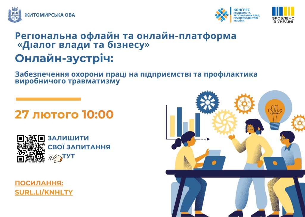 27 лютого о 10:00 у рамках проєкту «Діалог влади та бізнесу» відбудеться чергове засідання на тему: «Забезпечення охорони праці на підприємстві та профілактика виробничого травматизму».