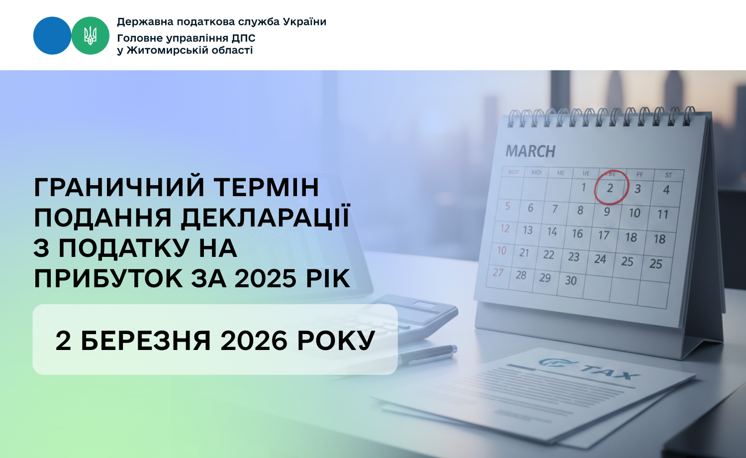 Головне управління ДПС в Житомирській області нагадує платникам податку на прибуток, що річну декларацію з податку на прибуток за 2025 рік необхідно подати до контролюючого органу за основним місцем обліку не пізніше 2 березня 2026 року. Цей термін визначено з урахуванням норм Податкового кодексу: оскільки 1 березня припадає на неділю. Останнім днем вважається наступний робочий день.