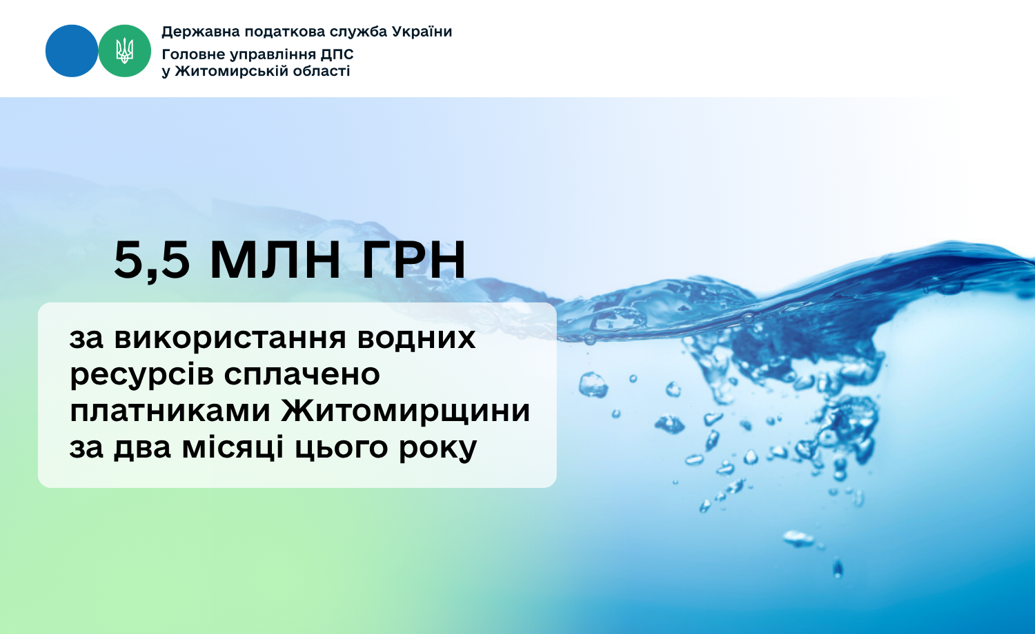 За два місяці цього року суб’єкти господарювання Житомирщини, що у своїй діяльності використовують водні ресурси, спрямували до бюджетів 5,5 млн гривень рентної плати за спеціальне використання води.