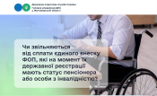 Головне управління ДПС у Житомирській області повідомляє, що частиною четвертою ст. 4 Закону України від 08 липня 2010 року № 2464-VI «Про збір та облік єдиного внеску на загальнообов’язкове державне соціальне страхування» (далі – Закон № 2464) встановлено, що, зокрема, фізичні особи – підприємці, в тому числі ті, які обрали спрощену систему оподаткування (крім електронних резидентів (е-резидентів), звільняються від сплати за себе єдиного внеску на загальнообов’язкове державне соціальне страхування (далі – єдиний внесок), якщо вони отримують пенсію за віком або за вислугу років, або є особами з інвалідністю, або досягли віку, встановленого ст. 26 Закону України від 09 липня 2003 року № 1058-IV «Про загальнообов’язкове державне пенсійне страхування» (далі – Закон № 1058), та отримують відповідно до закону пенсію або соціальну допомогу.