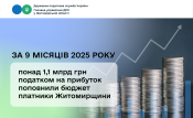 Платниками Житомирської області за дев’ять місяців цього року перераховано до зведеного бюджету 1 млрд 173,5 млн грн податку на прибуток, із них: до державного – 1 млрд 13,3 млн грн, до місцевих бюджетів громад – 160,2 млн гривень.