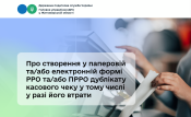 Враховуючи вищевикладене, створення у паперовій та/або електронній формі РРО та/або ПРРО дублікату фіскального касового чеку у разі його втрати функціями РРО та/або ПРРО та нормами чинного законодавства не передбачено, оскільки при створенні Z-звіту відбувається обнулення регістрів денних підсумків оперативної пам’яті та даний звіт містить підсумки розрахункових операцій за реалізовані товари (надані послуги) за кожним зазначеним кодом окремо з моменту програмування товару (послуги) із зазначенням його найменування, реалізованої кількості, літерного позначення ставки податку на додану вартість і загальний підсумок розрахункових операцій за реалізовані товари (надані послуги).