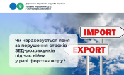 Порушення резидентами граничного строку розрахунків, згідно із частиною п’ятою ст. 13 Закону № 2473, тягне за собою нарахування пені за кожний день прострочення в розмірі 0,3 відс. суми неодержаних грошових коштів за договором (вартості недопоставленого товару) у національній валюті або в іноземній валюті, перерахованій у національну валюту за курсом Національного банку України, встановленим на день виникнення заборгованості.