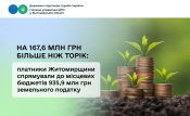 За десять місяців цього року місцеві бюджети Житомирської області поповнились на 935,9 млн грн земельного податку. Це на 167,6 млн грн більше, чим в аналогічному періоді минулого року.