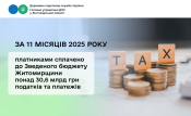 За оперативними даними до Зведеного бюджету Житомирської області за січень – листопад 2025 року платниками сплачено 30613,9 млн гривень податків та платежів. Додатково до надходжень минулого року забезпечено 5729,5 млн гривень, або на 23,0 відс. більше.