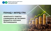 За одинадцять місяців цього року місцеві бюджети Житомирської області отримали 1 млрд 25,7 млн грн земельного податку. Це на 177,8 млн грн більше, проти відповідного періоду минулого року.