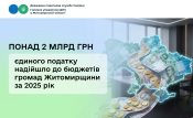 За 2025 рік до бюджетів громад Житомирщини надійшло понад 2 млрд грн єдиного податку