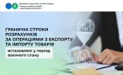 Так, відповідно до п. 14 прим. 2 Постанови № 18 на період воєнного стану граничні строки розрахунків за операціями з експорту та імпорту товарів становлять 180 календарних днів та застосовуються до операцій, здійснених з 05 квітня 2022 року.