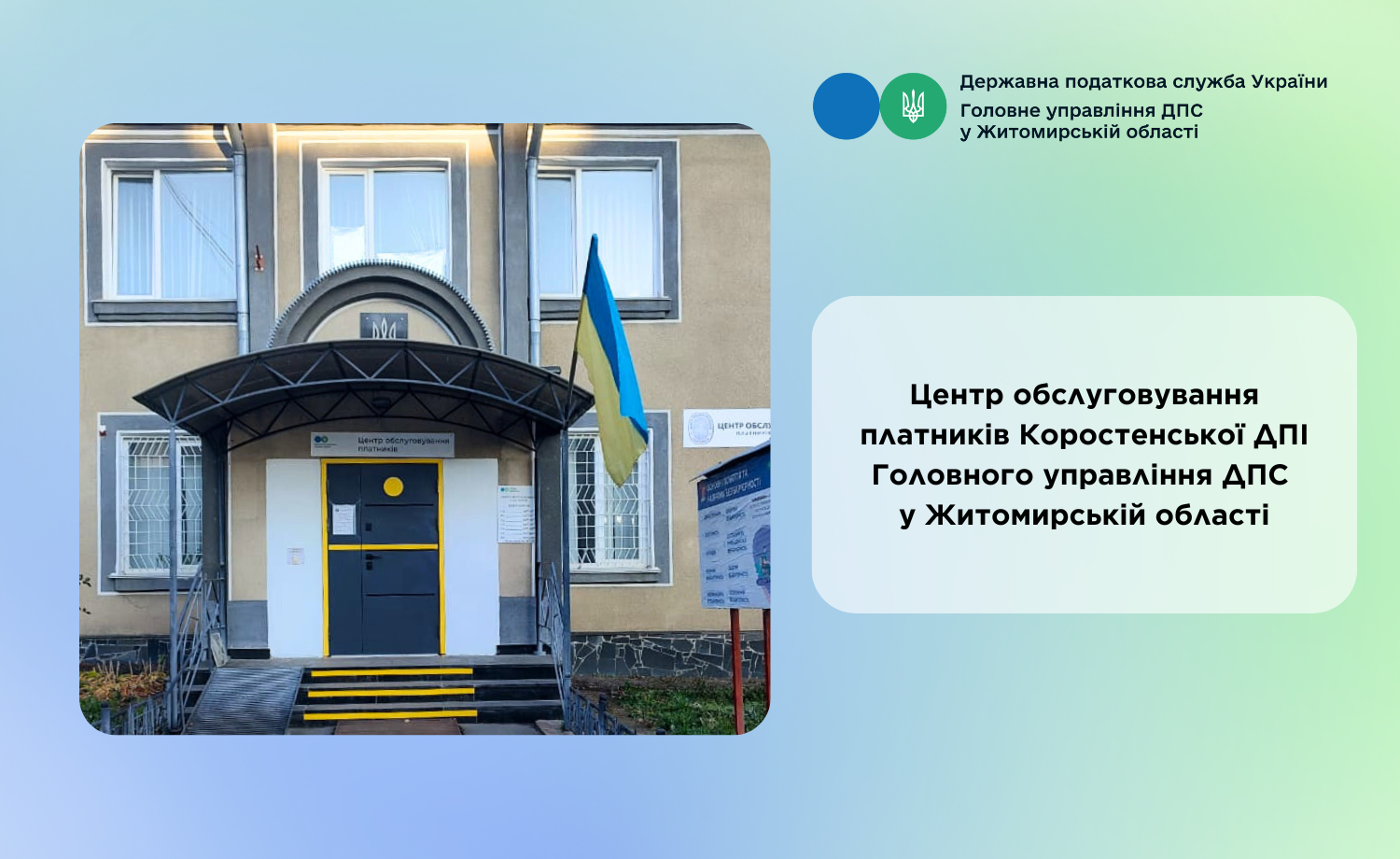 Розташований в приміщенні Центру обслуговування платників Житомирської ДПІ Головного управління ДПС у Житомирській області, на першому поверсі.